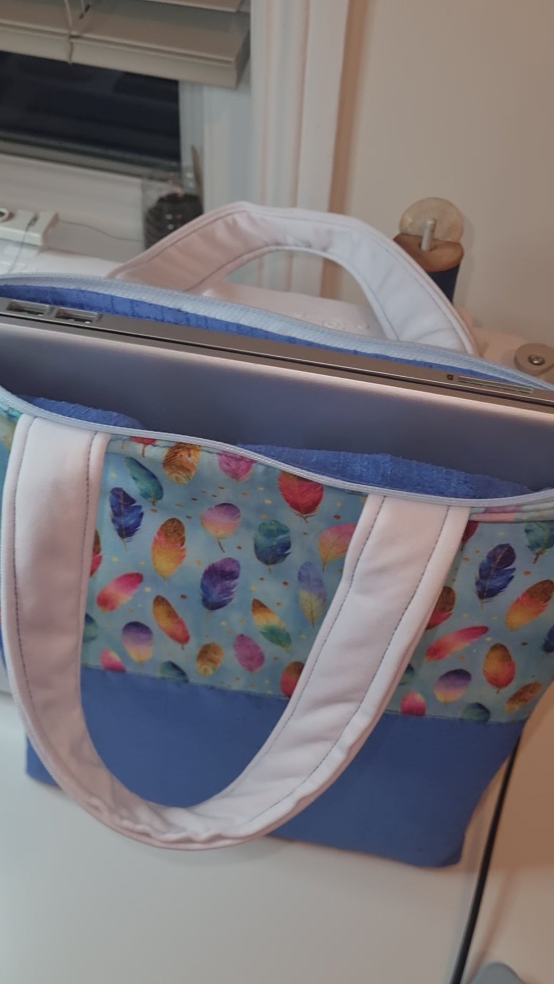 This laptop/tablet case with a zipper and sturdy handles measures 36cm without handles and 50cm with the handles. The width is 28cm. The depth is 5cm and some extra room.
